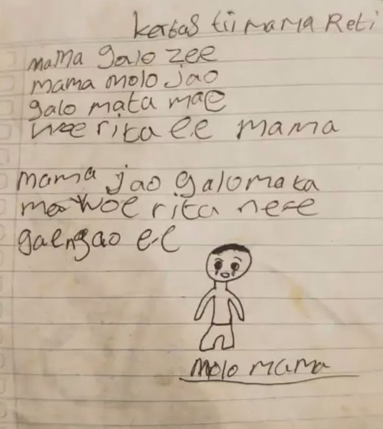 Kertas Tii Mama Reti (Surat untuk mama Reti)Mama Galo Zee (Mama pelit sekali)Mama molo Ja’o Galo mata Mae Rita ee Mama (Mama baik sudah. Kalau saya meninggal mama jangan menangis)Mama jao Galo Mata Mae woe Rita ne’e gae ngao ee (Mama saya meninggal, jangan menangis juga jangan cari saya ee)Molo Mama (Selamat tinggal mama)