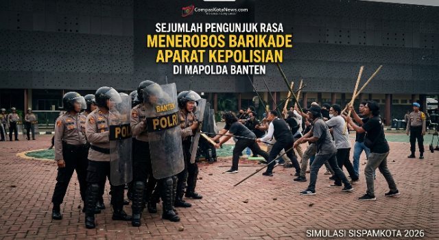 Serang, CompasKotaNews.com – Sejumlah pengunjuk rasa dalam simulasi Sistem Pengamanan Kota (Sispamkota) berupaya menerobos barikade aparat kepolisian di Mapolda Banten, Senin (20/4/2026). Kegiatan ini digelar sebagai bagian dari persiapan pengamanan menjelang Hari Buruh Internasional (May Day).